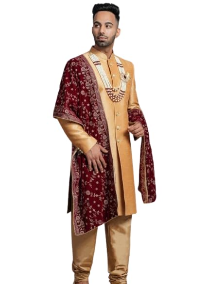 Step into timeless elegance with this men’s asymmetric Indo Western sherwani set, designed to make a bold fashion statement at weddings, receptions, sangeet, or festive gatherings. This outfit features a finely embroidered long sherwani with a front button closure and a high-neck collar, complemented by an eye-catching asymmetric hemline. The rich texture of the fabric, along with its intricate patterns, adds a touch of regal charm, ensuring you stand out in every celebration. The dhoti-style pants are crafted from premium quality fabric that provides both style and comfort, allowing ease of movement without compromising on tradition. This ensemble comes with a matching pocket square that enhances its sophisticated appeal. Ideal for the modern man who values cultural roots while embracing contemporary style. Tailored with attention to detail, this sherwani set is perfect for grooms, groomsmen, or anyone attending traditional functions. Whether you’re attending a wedding or festive occasion, this outfit offers an impeccable fusion of classic and modern design. The breathable and soft inner lining ensures you stay comfortable throughout long events. Pair it with traditional mojaris or juttis for a complete ethnic look. This set is a true reflection of Indian craftsmanship and heritage with a modern twist.