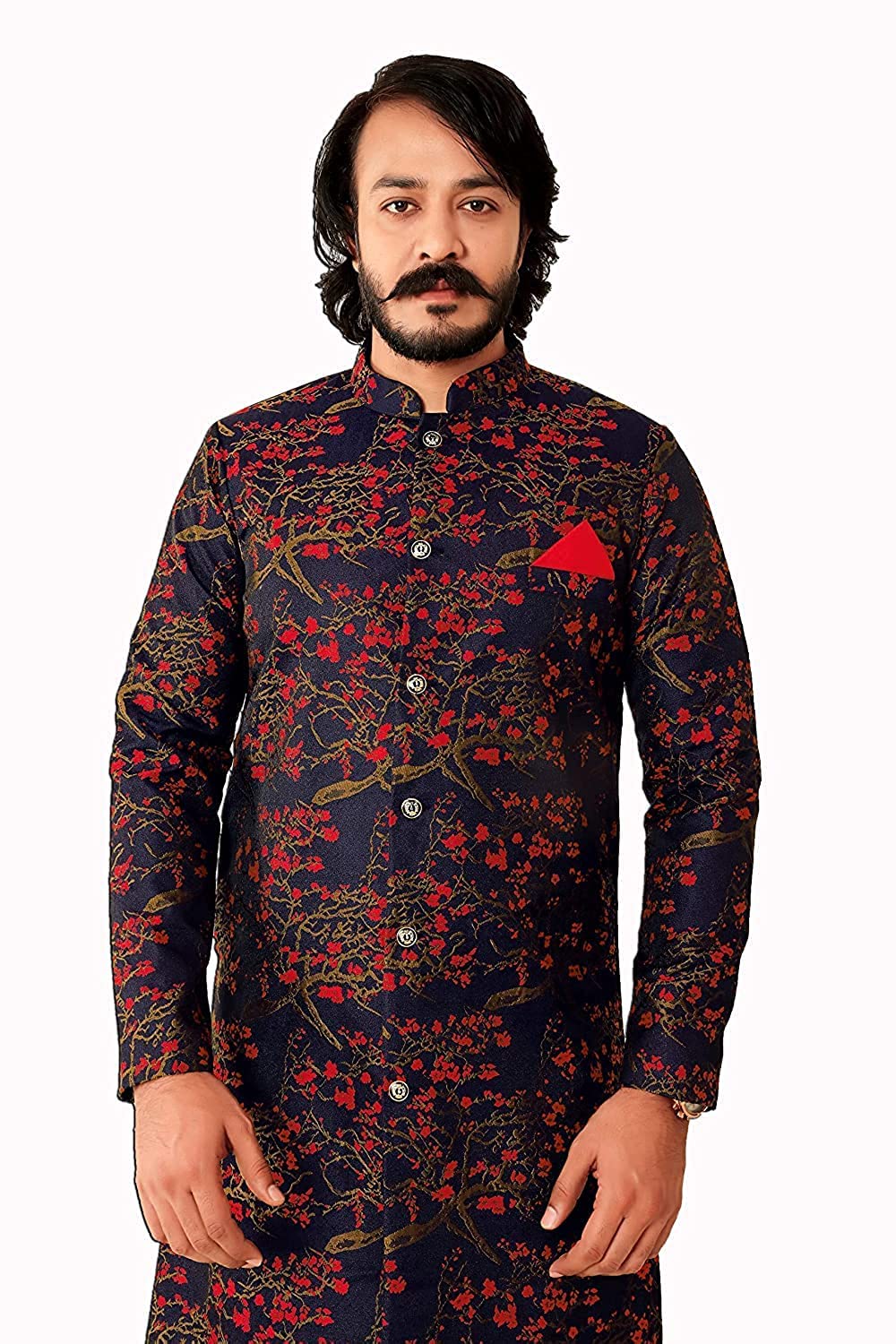 Amzira Men’s Cotton Silk Printed Sherwani Set with Mandrian Collared Neck Long Sleeves Button Closure Kurta and Solid Pyjama