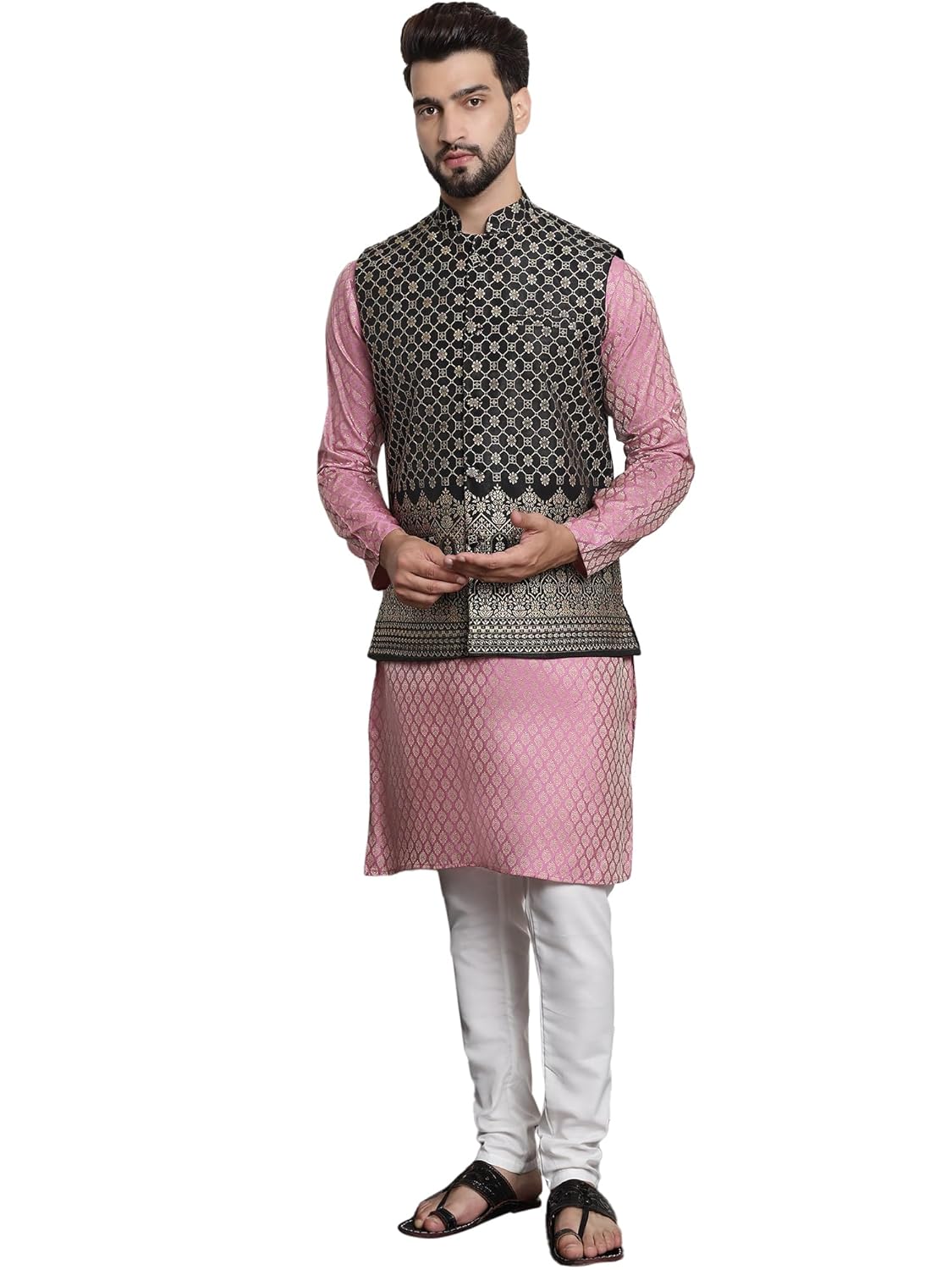 This traditional Indian kurta Pyjama jacket set includes a kurta with elegant waistcoat and a Churidar pyjama. Regular comfortable fitting makes it great wear.