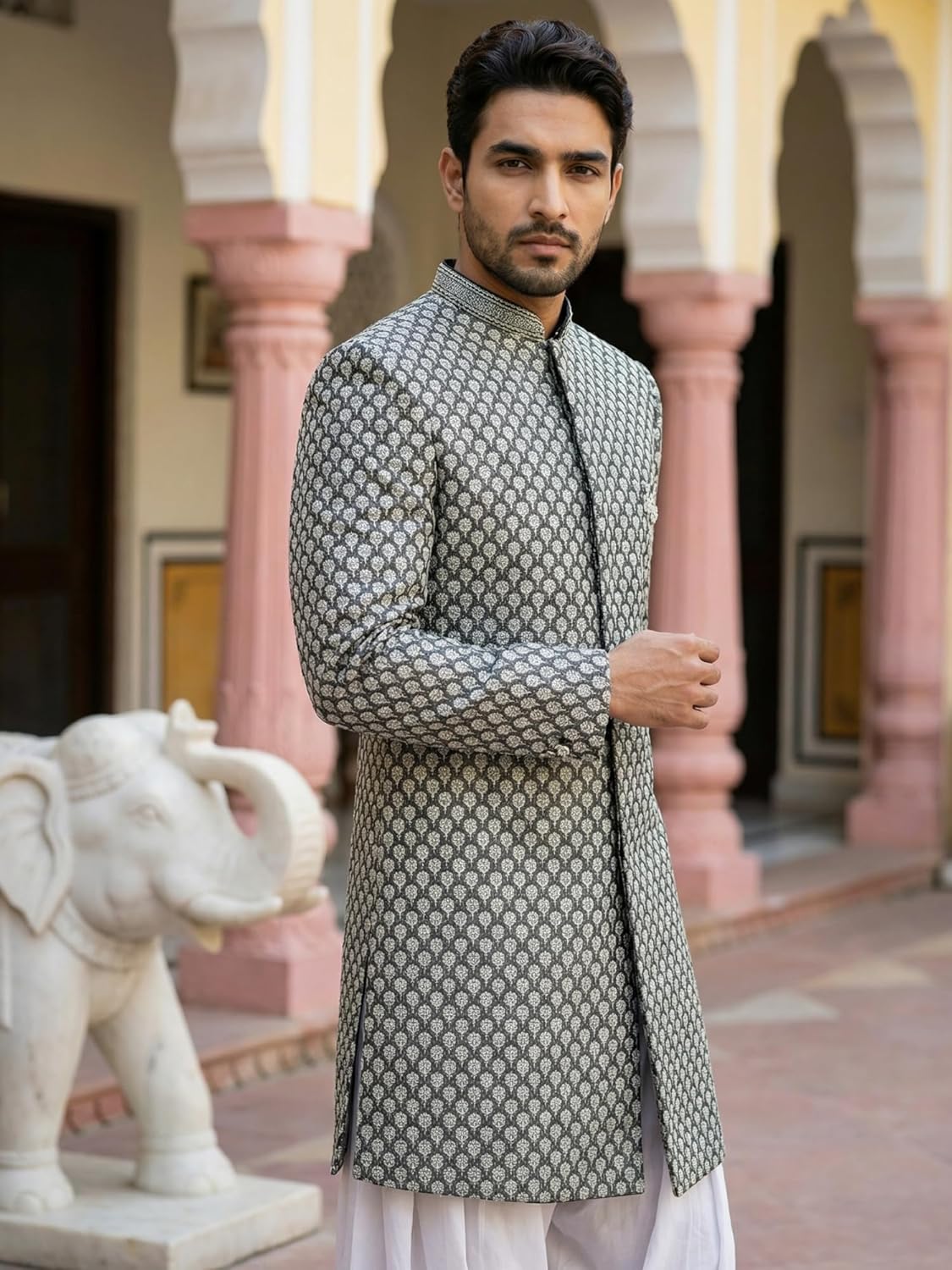 Silk-blend embroidered Indo-Western sherwani with mandarin collar and front buttons. Tailored fit with knee-length design. Comes with Salwar bottom. Ideal for weddings and festive occasions.
