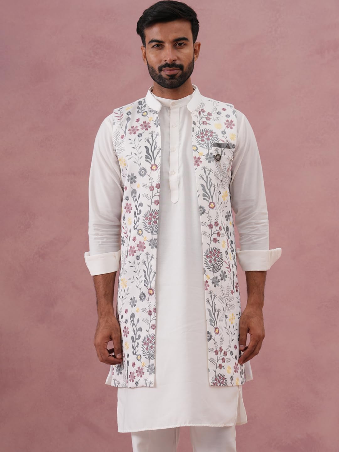 This elegant embroidered sherwani set blends contemporary pastel tones with classic Indian craftsmanship, making it a refined choice for festive and wedding occasions.