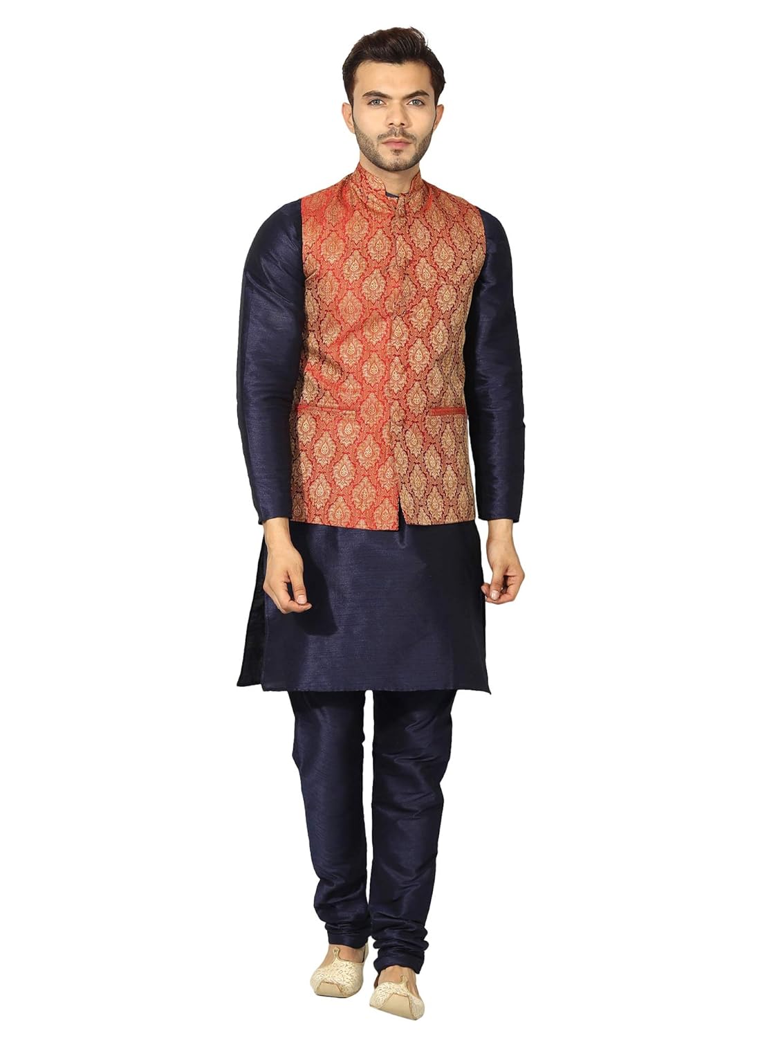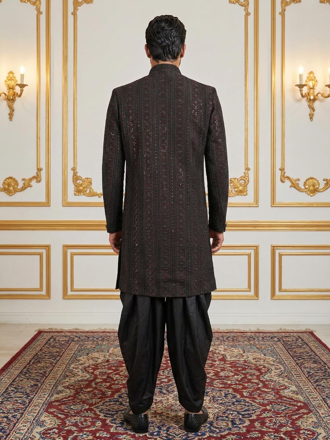 This men’s embroidered Indo-Western set features a premium jacquard texture, mandarin collar, and tailored fit, making it ideal for weddings, festive wear, and party occasions.