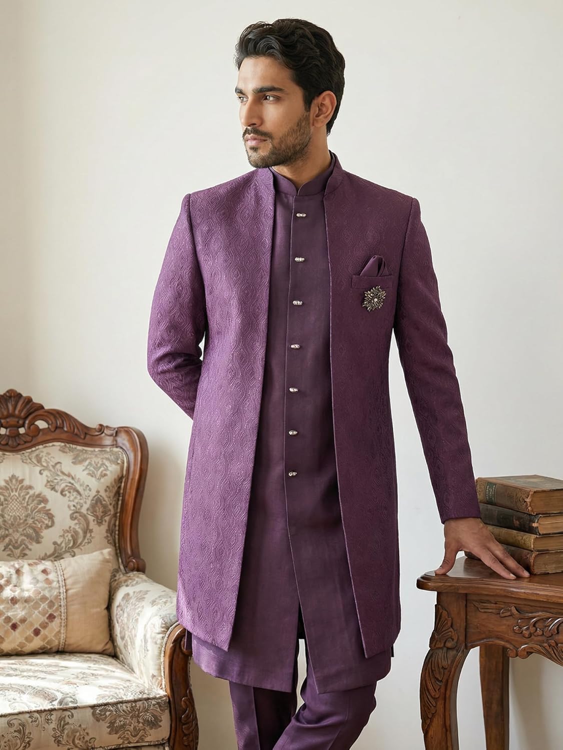 Refined Indo-Western set crafted in cotton blend textured fabric, featuring a mandarin collar and structured button front. Paired with a coordinated kurta and tailored trouser for a polished festive and wedding look.