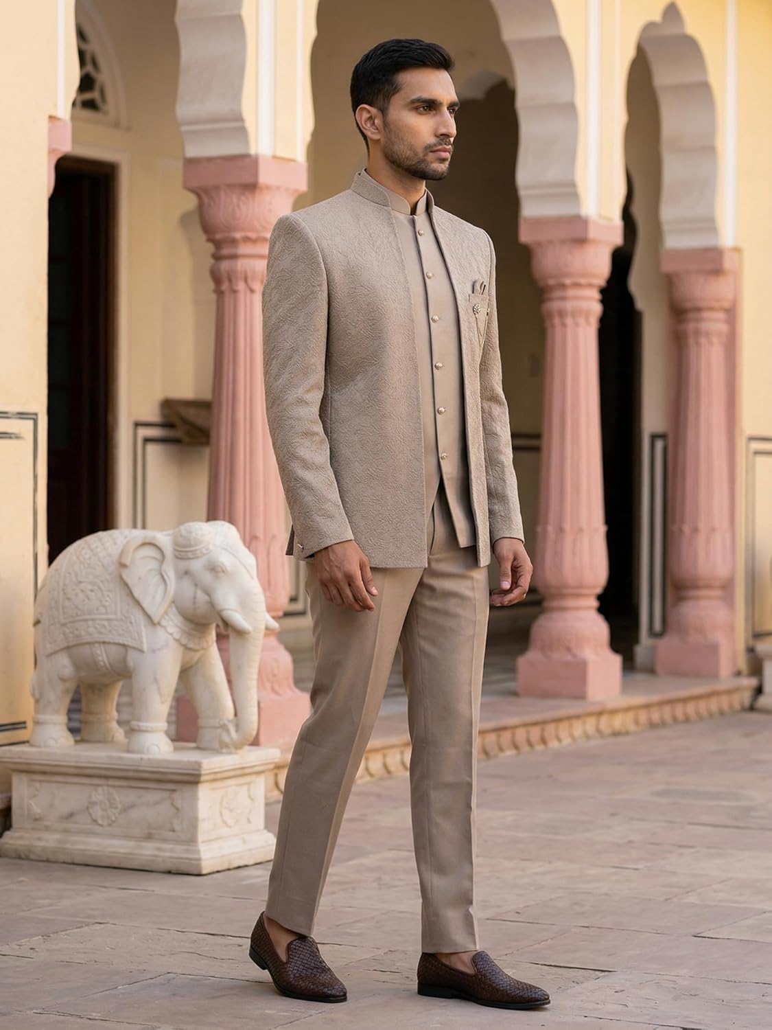 this premium Indo-Western set featuring an intricately embroidered open jacket paired with a solid waistcoat and tailored trousers. The soft pastel tone and modern silhouette make it perfect for weddings, receptions, and special occasions.
