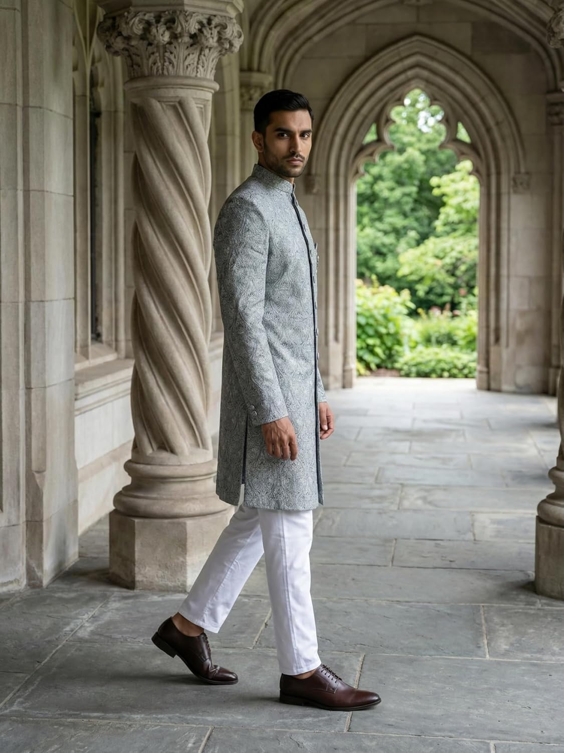 A stylish Indo-Western set with classic paisley prints on a textured jacquard base. The clean design and structured fit offer a sharp look, perfect for occasions that call for understated elegance.