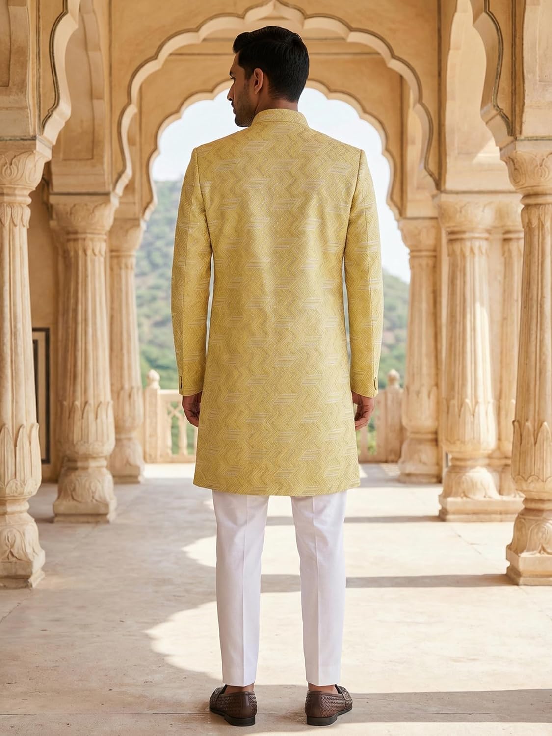 Premium jacquard silk sherwani set featuring an intricate woven geometric pattern, mandarin collar, and buttoned front. Designed with a pocket square and brooch detail, paired with a tailored trouser for a complete festive ensemble.