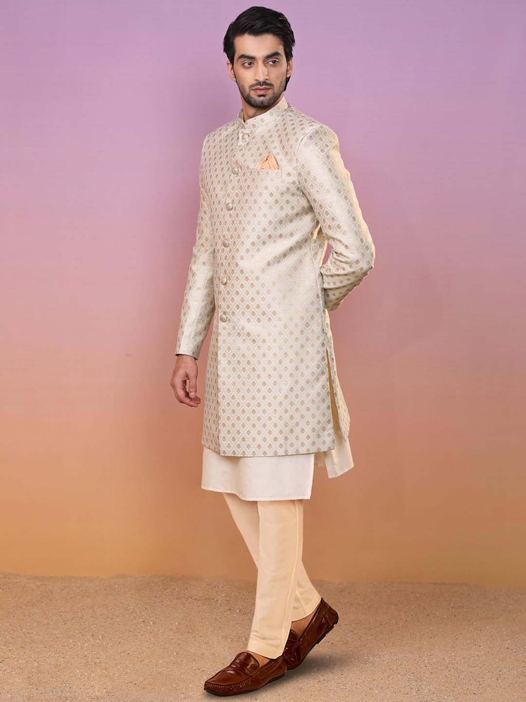 Discover a wide range of elegantly designed Kurta Sherwani Dhoti Set that embody traditional charm and modern style, these sherwani sets are perfect for grooms and groomsmen, featuring exquisite embroidery and opulent designs