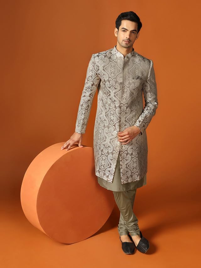 Discover a wide range of elegantly designed Kurta Sherwani Dhoti Set that embody traditional charm and modern style, these sherwani sets are perfect for grooms and groomsmen, featuring exquisite embroidery and opulent designs