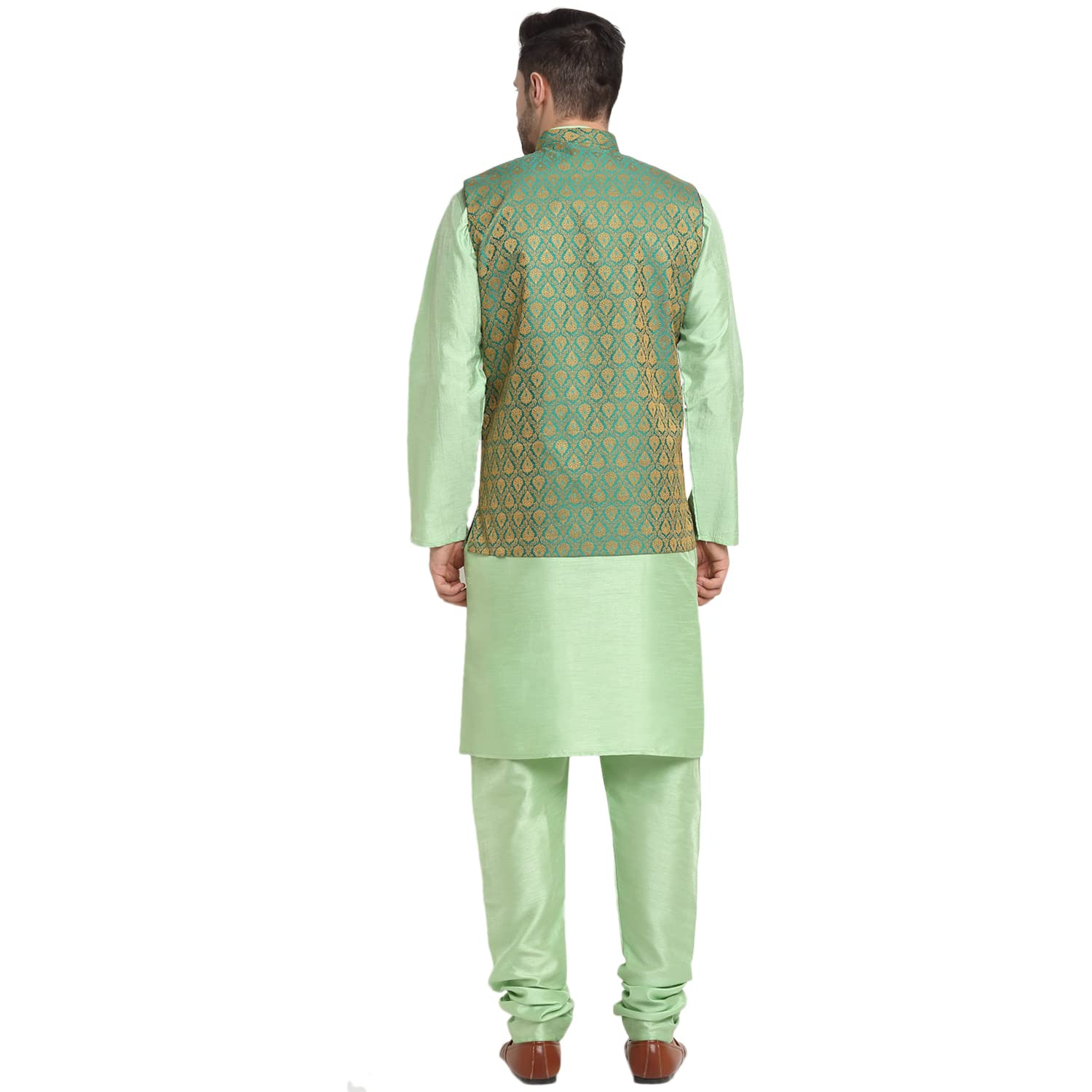 The Paisley Nehru Jacket, featuring a mandarin collar adds a touch of sophistication to the ensemble, elevating your look to new heights of elegance. Whether you’re attending a wedding, a gala dinner, or a cultural event, our Long Sleeve Knee Length Silk Kurta Set with Nehru Jacket is sure to turn heads and leave a lasting impression.