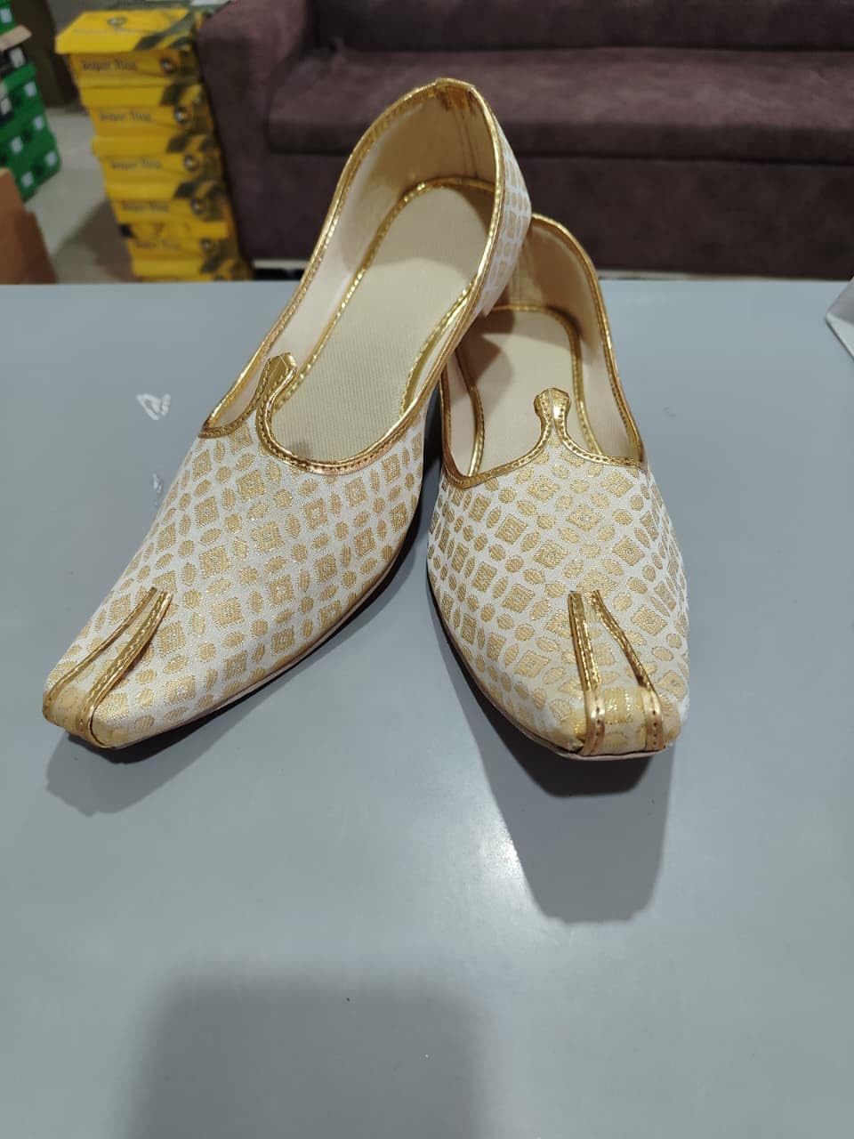Step into tradition with the Tango Toe Men’s Ethnic Gold Embroidered Jutti, a stunning pair of traditional Mojari shoes crafted for the modern Indian gentleman. Featuring an exquisite gold embroidered pattern on a crisp white base, these juttis are adorned with elegant gold trim detailing that lends them a regal, festive appeal. The distinctive pointed toe design is a hallmark of authentic Indian ethnic footwear, making these shoes a perfect complement to sherwanis, kurta pyjamas, and other traditional ensembles. Whether you are attending a wedding, a festive celebration, or any special occasion, these Mojari shoes will elevate your look effortlessly. The flat sole construction ensures comfort throughout the day, allowing you to celebrate in style without compromise. Suitable for all occasions, from grand wedding ceremonies to cultural festivities, these ethnic shoes are a wardrobe essential for every man who appreciates traditional Indian craftsmanship. Please refer to the size chart before placing your order to ensure the perfect fit.