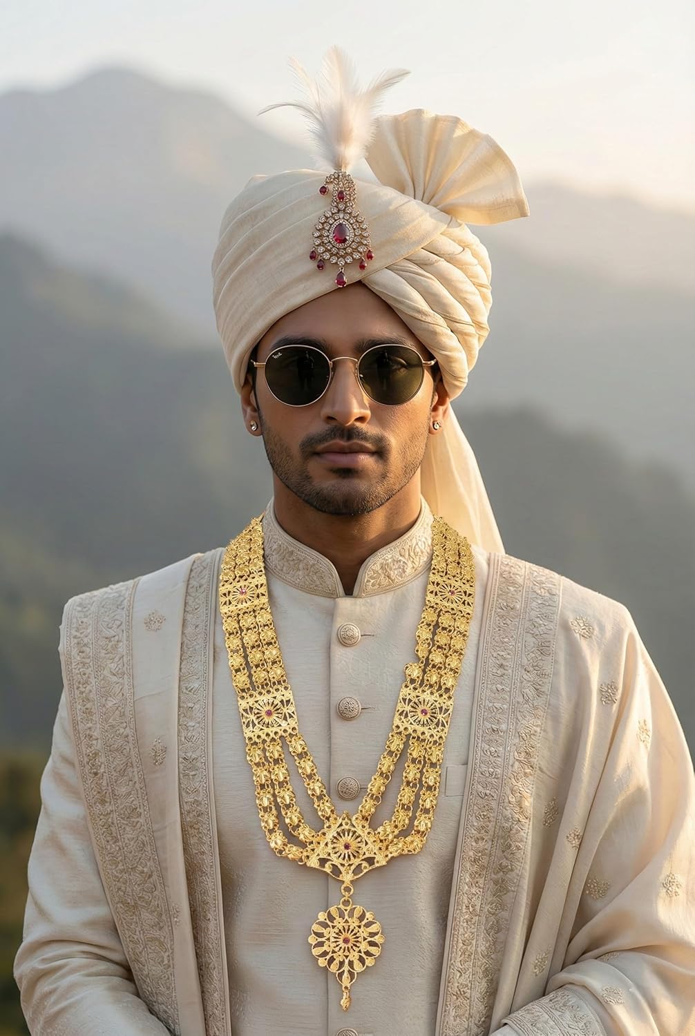 Step into timeless elegance with this royal layered groom necklace crafted to elevate traditional menswear. Featuring finely detailed filigree links, symmetrical medallion accents, and a luminous gold-finish surface, it reflects heritage craftsmanship with a contemporary edge. Whether styled with an embroidered sherwani or a classic achkan, this statement accessory adds ceremonial grandeur and refined masculinity—making it an ideal choice for weddings, receptions, and festive occasions.