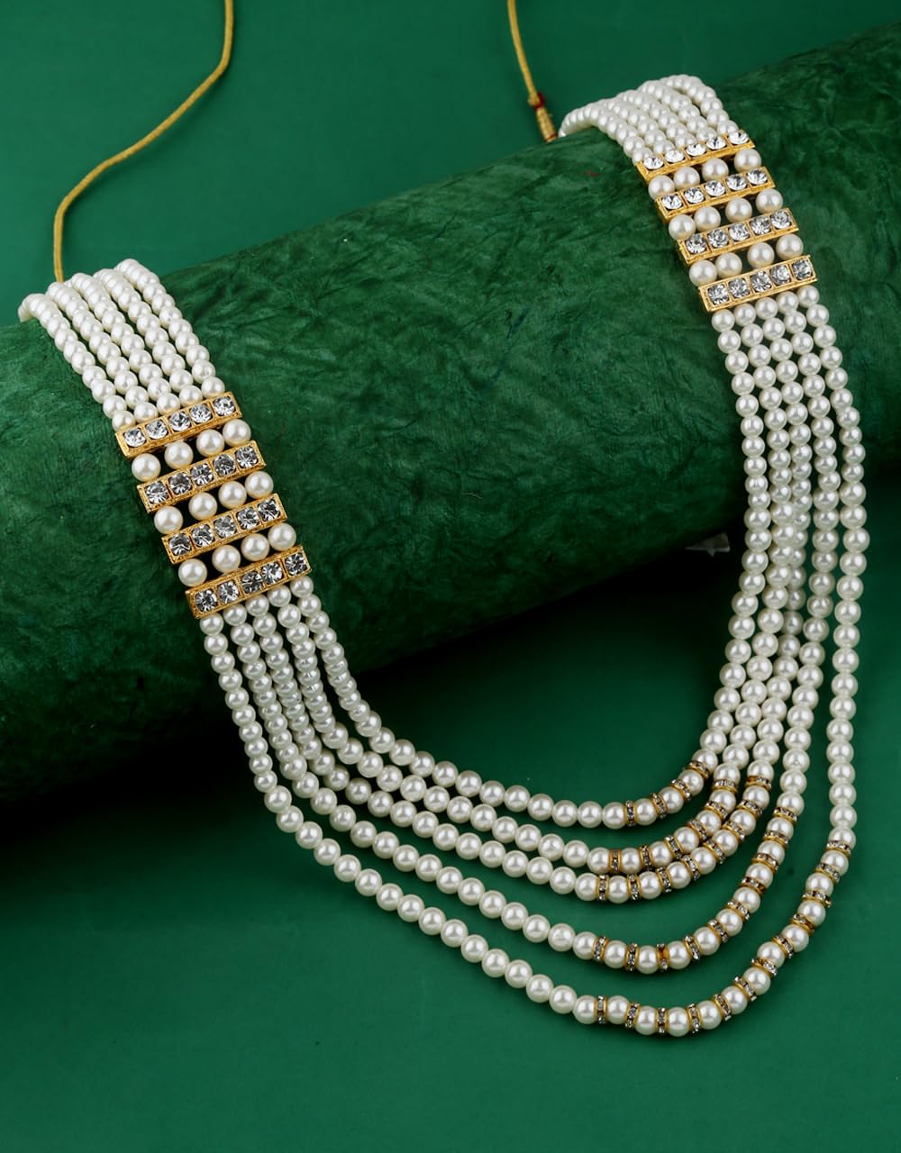 Anuradha Pearl’s presents a simple yet elegant five-layer traditional gold-plated white pearl necklace, perfect for grooms. This exquisite moti mala enhances sherwani attire with its timeless sophistication. Crafted with premium pearls and a refined gold-plated finish, it adds a touch of royal charm, making it an ideal choice for a majestic wedding look.