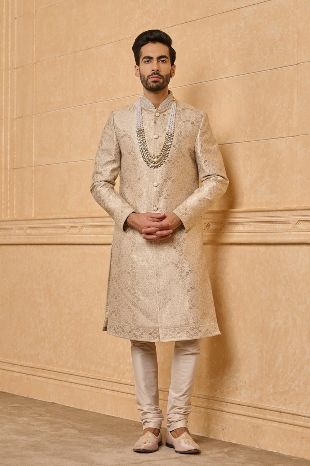 The gold brocade sherwani, is an ideal choice for the groom at Shadi. It comes with a sherwani, kurta, and churidar. Pair it with traditional gold jewelry and a classic stole for a majestic, regal appearance.