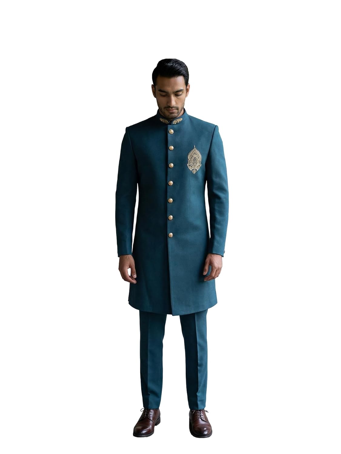 Elegant men's sherwani set featuring intricate embroidery, a tailored fit, and traditional designElegant men's sherwani set featuring intricate embroidery, a tailored fit, and traditional design