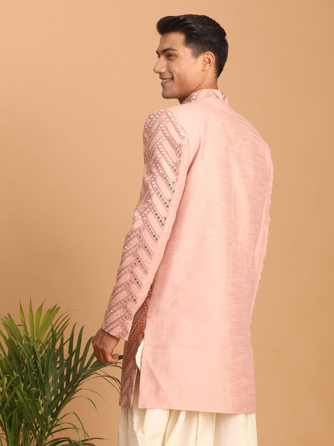 Fabric: Silk Blend | Contents: A Trend setting Men’s Indowestern Style Mirror Work Sherwani made of imported high quality fancy fabric.Comes with Cowl Style Patiala Dhoti Pant Set.Trend setting Men’s Indowestern Style Mirror Work Sherwani made of imported high quality fancy fabric.Comes with Cowl Style Patiala Dhoti Pant Set.All our Sherwanis have four inches loosening over the body measurement. So if your chest round measurement is 38 inches then you should go for a 38 (Medium) size Kurta which will have a garment ready chest measurement of 42 inches. Vastramay introduces to you these classy sherwani for men stylish latest design in variety of material and designs for all occassions. This men’s ethnic wear fabric has been designed keeping in mind the latest trends in a semi formal fashion or occassional fashion. Engineering garments which fit all body types and style is our aim. We offer not just servani for man for wedding but also indo western for men and semi sherwani as well covering the entire space. Our servani are constructed in such a way that you can adorn it with a churidar, dhoti for men or a patiala too. To complete the look adorn a mojari or jutti slippers for men stylish, you may also try an authentic Kohlapuri chappal for men, the fashionistas and millennial folks may experiment with a brogues or oxfords juta for men stylish. Suitable for: Party, Weddings, Sangeet, Mehandi, Regular Wear, Celebrations, Occasions, Festivals, Lohri, Pongal, Makar Sakranti, Baisakhi, Saraswati Puja, Holi, Ugadi, Jamai Sasthi, Eid, Raksha Bandhan, Dussehra, Diwali, Navratri, Pooja, Christmas, Onam, Ganesh Chaturthi, Janmasthmi and Gifts for Men.Suitable for: Party, Weddings, Regular Wear, Celebrations, Occasions, Festivals, Lohri, Pongal, Makar Sakranti, Baisakhi, Holi, Eid, Raksha Bandhan, Dussehra, Diwali, Navratri, Pooja, Christmas, Onam, Ganesh Chaturthi, Janmasthmi and Gifts for Mens.Customer’s discretion is advised.
