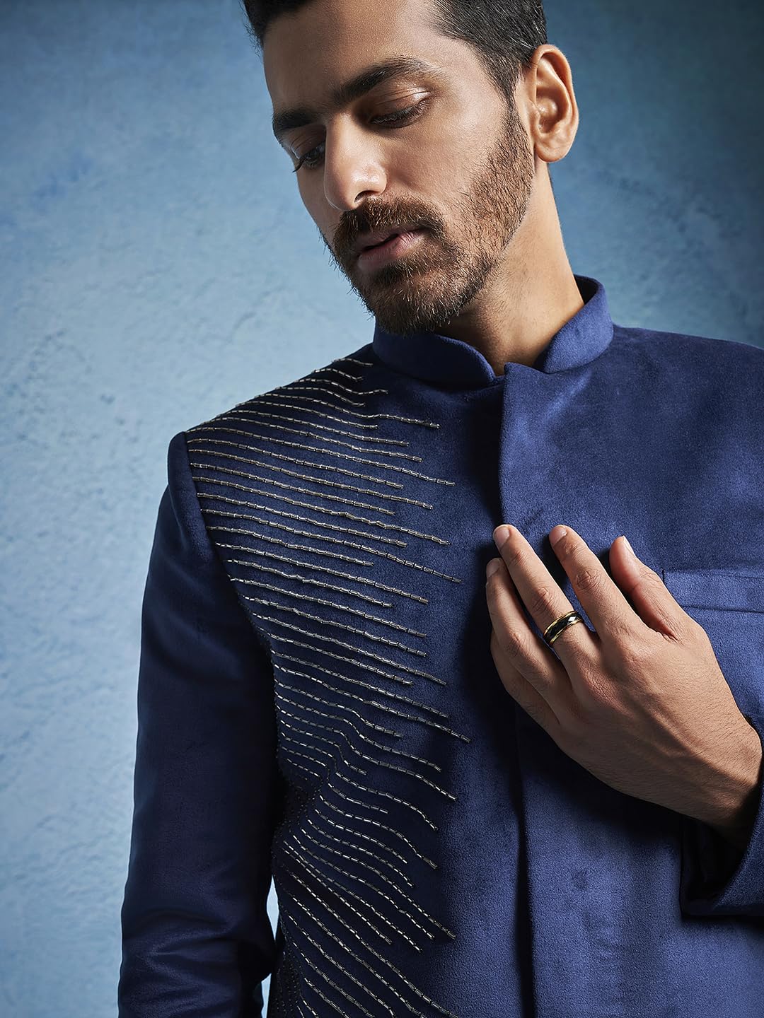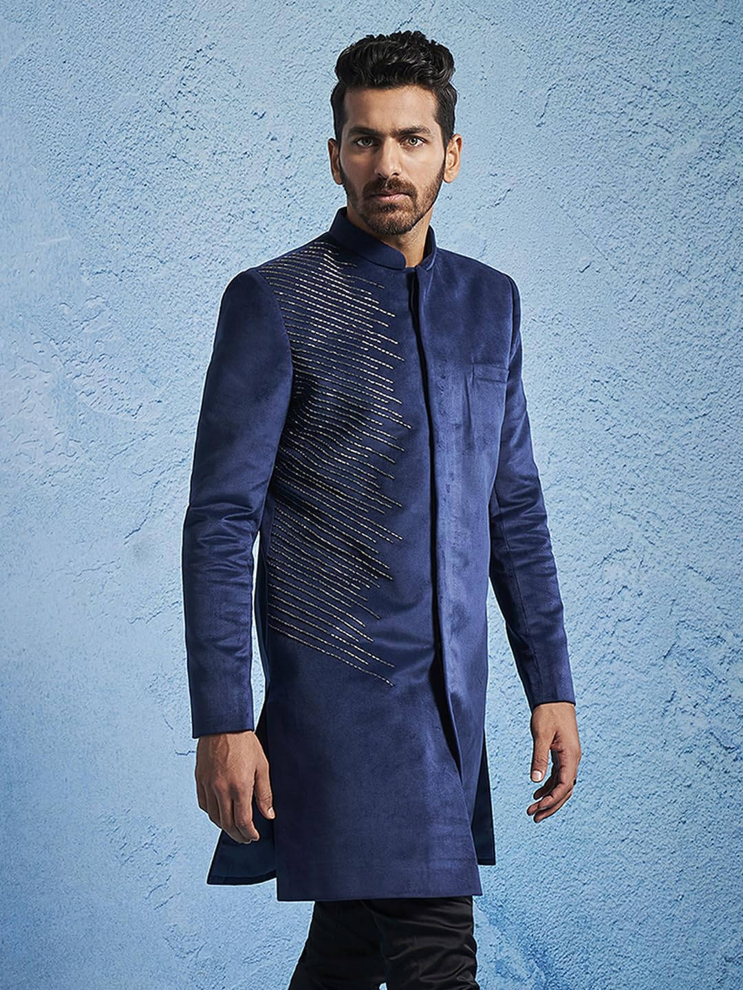Velvet Embroidered sequiend knee length regular sherwani, has a mandarin collar, long sleeves,Wear it in parties,traditional functions and festive occasion.